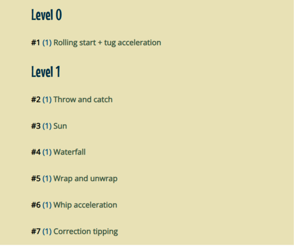 The tricks are organised into 10 levels of complexity. Level 0 is how to start your diabolo and level 10 includes 3 diabolo tricks such as 531 high or FTS 2-3-22-3.