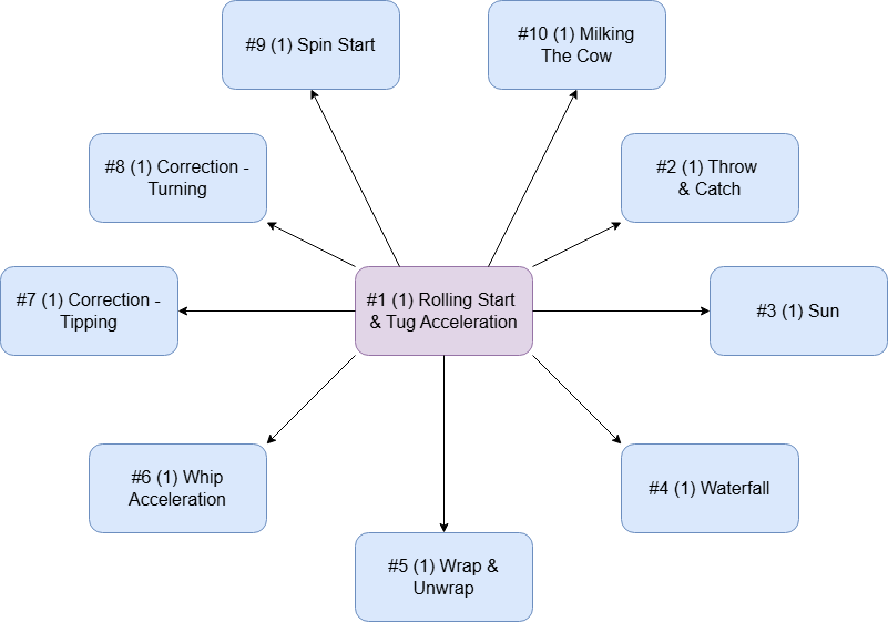 This trick is part of the Diabolo Trick Roadmap (also available on Amazon) which is a skill tree (containing 337 tricks from 1 to 3 diabolos) designed to give you a personalized list of tricks you’re ready to learn, taking into account the tricks you already know.